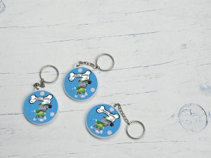 Mavi zemin üzerine evimli köpek kemik temalı açacak anahtarlık