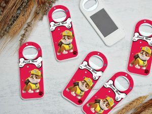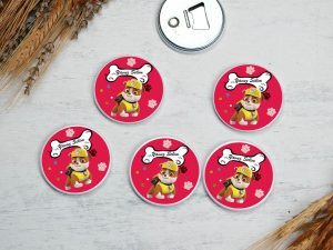 Kırmızı zemin üzerine sevimli köpek temalı buton açacak magnet