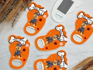 Turuncu zemin ve sevimli köpek temalı ayak açacak magnet