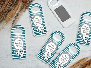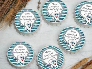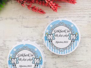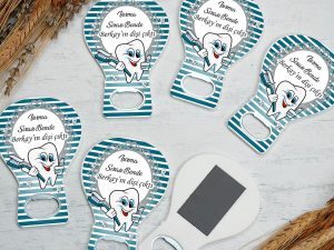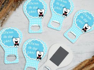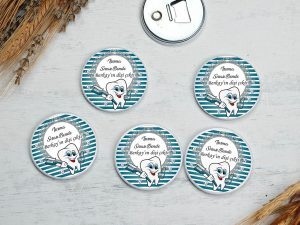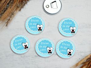 Mavi çizgi arka zemin ve gülen diş temalı yuvarlak açacak magnet