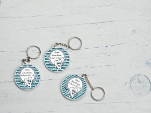 Mavi çizgi arka zemin ve gülen diş temalı açacaklı anahtarlık