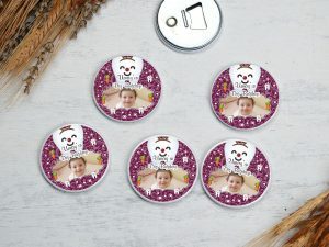 Yıldızlar diş ve havuç desenli, fotoğraf baskılı buton açacak magnet