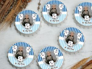 Gülen dişler ve mavi çizgi desenli fotoğraf baskılı buton açacak magnet