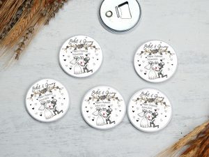 Evlenen mutlu çift temalı kalp desenli buton açacak magnet