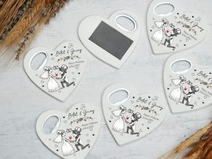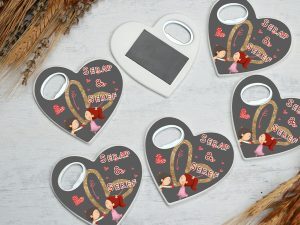 Evlenen mutlu çift temalı kalp desenli dik açacak magnet