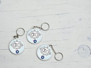 Çapraz mavi çizgi ve nazar boncuğu desenli açacak anahtarlık