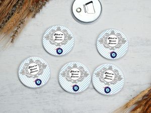 Çapraz mavi çizgi ve nazar boncuğu desenli buton açacak magnet