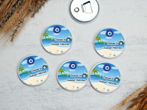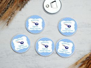 Çapraz mavi çizgi ve nazar boncuğu desenli yuvarlak açacak magnet