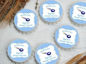 Beyaz yuvarlak puantiye desenli, sünnet temalı yuvarlak açacak magnet