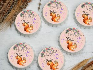 Çiçek çerçeveli ve çiçek taçlı sincap temalı yuvarlak açacak magnet