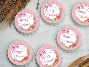 Çiçek çerçeveli, tavşan desenli doğum günü temalı yuvarlak açacak magnet
