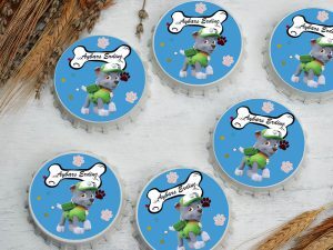 Mavi zemin üzerine sevimli köpek kemik temalı yuvarlak açacak magnet