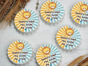 Yıldız ve oturan aslan desenli yuvarlak açacak magnet